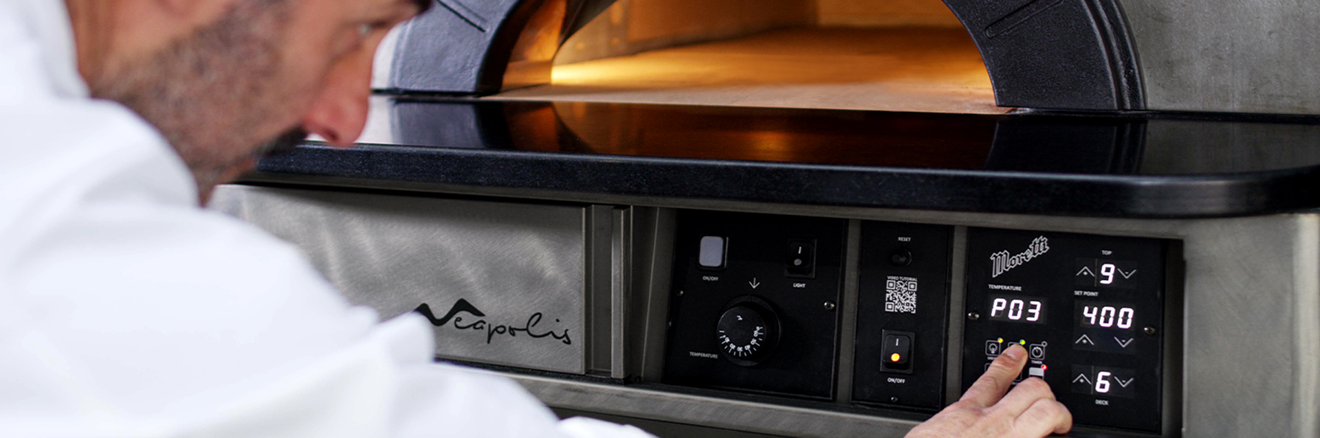 Preheat Neapolis with the deflectors lowered, setting the set point at 420 °C / 788 °F, top 7, deck 4 (light off and door closed), press start/stop and wait for it to reach temperature (approximately 2h when cold, 1h if the oven has worked in the previous shift). When the set temperature is reached, change the set point to 450- 480 °C / 842 – 896 °F top 8, deck 5 and wait for it to reach temperature again, then open the door and in 10 minutes it will be ready to start baking, paying particular attention to the first pizzas.