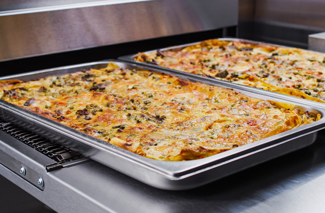 serieT è il forno a tunnel ideale per cuocere arrosti o succulente costolette, torte salate, verdure, timballi, patate dorate o appetitose lasagne.