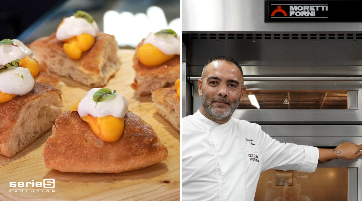 Nov112021RICETTEserieS facilita la gestione della linea di produzione. Il calore perfetto permette di preparare comodamente e in anticipo le basi della pizza in padellino per poi guarnirla al momento del servizio che risulterà efficiente e veloce, con piena soddisfazione dei clienti. In questa ricetta del Padellino gourmet spuma di gorgonzola, zucca scottata e zeste di lime, il Pizza Chef Pasquale Moro ci illustra nel dettaglio le fasi di precottura, cottura del topping e rigenero. Vediamo come: Pizza al padellino ricetta INGREDIENTI Per l’impasto Biga (1000g farina, 444g acqua, 10g lievito) 1454 g Farina multicereali tipo 1 1000 g Acqua 1056 g Olio extra vergine d’oliva 40 g Zucchero 20 g Malto 20 g Lievito 25 g Supporto necessario padellino ø22 H 4cm Calore: serieS Stonebake, 240°C, 40% cielo, 30% platea – Tempo di cottura 9 minuti Per la farcitura: Zucca scottata 300 g Gorgonzola 100 g Panna da cucina 100 g Formaggio spalmabile 100 g Zeste di lime (naturale non trattato) q.b. PROCEDIMENTO Per il procedimento della biga clicca qui Inserire nell’impastatrice tutti gli ingredienti per l’impasto tranne il sale, l’olio. Tenere da parte acqua a sufficienza affinché l’idratazione dell’impasto tra biga e farina di rinfresco sia al 60%. Impastare per circa 9 minuti in prima velocità, quindi passare in seconda. A glutine parzialmente strutturato inserire metà dell’olio, a seguire l’acqua finale a filo e, a metà dell’acqua finale, aggiungere il restante l’olio. Temperatura finale impasto 26°C circa. Far puntare in vasca per 45 minuti e poi procedere con la spezzatura a 280g. Far fare una prima lievitazione fino al raddoppio del volume, stendere nel padellino leggermente unto e lasciare lievitare per circa 40 minuti. Schiacciare l’impasto con la mano unta e far riposare per altri 30 minuti. Schiacciare nuovamente e lasciar lievitare per circa un’ora. Come cuocere pizza al padellino Per la precottura in serieS infornare il padellino a 240°C: 40% cielo e 30% platea per poi abbassare subito il cielo al 20%. Cuocere per circa 9 minuti. Sfornare, far raffreddare, imbustare e conservare in ATM. Per la farcitura: Preparare la spuma sciogliendo il gorgonzola a bagnomaria, fino a raggiungere i 90°C. Inserirvi la panna da cucina e il formaggio spalmabile, proseguendo con la cottura a bagnomaria. Quando tutti i formaggi saranno sciolti, emulsionare con una frusta fino ad amalgamare bene il composto. Far raffreddare tutto completamente e inserire in un sifone lasciando a riposare in frigorifero per 3 ore. Scottare la zucca distesa in una teglia alluminata, su serieS a 160°C, 50% cielo e 20% platea per circa 20 minuti. Passare in un blender per 5 minuti a 20mila giri. Al momento del servizio rigenerare il padellino nella sua teglia per circa 4 minuti in serieS: 250°C: 70% cielo e 20% platea. Sfornare, tagliare e guarnire con la crema di zucca tiepida, il gorgonzola sfumato e le zeste di lime grattugiato. Leggi ancheBomboloncini al forno con cioccolato e lamponi7 Luglio 2025Colomba tradizionale18 Aprile 2025Bagels6 Settembre 2024Éclair Mojito10 Agosto 2024Pizza Peach Summer5 Luglio 2024Pane al cioccolato con lievito madre14 Giugno 2024
