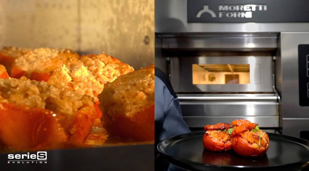 Set32023RICETTECome antipasto, come contorno o come piatto vegetariano unico, i pomodori ripieni sono un’ottima proposta nei menù di fine estate. In Italia ci sono tante versioni, noi vi proponiamo quella ripiena di riso e parmigiano, completamente vegetariana. Grazie alla tecnologia Dual-Power di serieS, non solo vi assicurerete una cottura perfettamente uniforme, ma potrete anche gestire la gratinatura come preferite intensificandola o alleggerendola. Ricetta pomodori ripieni INGREDIENTI Pomodori rossi a grappolo 12 pz. Riso parboiled 250 g Parmigiano Aglio 2 spicchi Olio q.b. Sale q.b. Pepe q.b. Menta q.b. Basilico q.b. Prezzemolo q.b. Calore: serieS Multibake, 200 °C, 30% cielo, 40% platea, 20 minuti. PROCEDIMENTO Come fare i pomodori ripieni Tagliare il fondo ai pomodori, rimuovere i semi e la parte centrale con un cucchiaio, conservare il composto. Condire il composto con sale, pepe, menta, basilico e prezzemolo per poi frullarlo con un frullatore ad immersione. In una teglia, unire l’olio e gli spicchi d’aglio, infornare finché l’aglio non soffriggerà. Aggiungere il composto precedentemente frullato e condito e infornare nuovamente per 5/10 minuti. Una volta sfornato mescolare il liquido con parmigiano e riso crudo. Condire poi i pomodori con sale e olio e riempirli col riso, una volta farciti, spolverare con dell’altro parmigiano. Cottura Settare serieS a 200 °C, 30% cielo e 50% platea. Una volta in temperatura infornare i pomodori e impostare un timer di 20 minuti. Regolare la potenza delle resistenze superiori con Dual-Power fino a raggiungere il grado di gratinatura desiderato. Scaduto il timer i pomodori saranno pronti per essere sfornati e serviti. Consiglio furbo: per testare cosa piace ai vostri clienti provate diverse farciture, con prosciutto e formaggio, con ragù di carne, o la versione vegana con riso e pane grattugiato. Leggi ancheBomboloncini al forno con cioccolato e lamponi7 Luglio 2025Colomba tradizionale18 Aprile 2025Bagels6 Settembre 2024Éclair Mojito10 Agosto 2024Pizza Peach Summer5 Luglio 2024Pane al cioccolato con lievito madre14 Giugno 2024